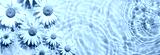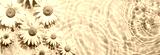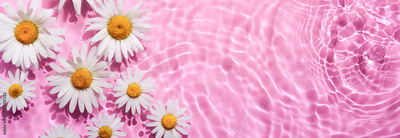 Chamomile flowers in pink water banner with concentric circles and ripples. Natural beauty Spa concept, Copy space