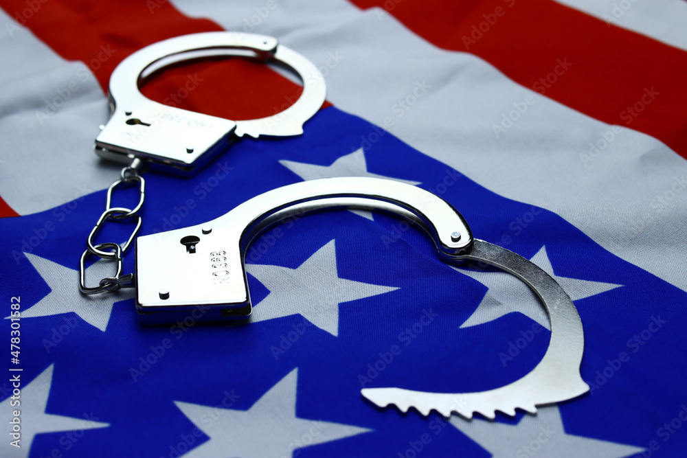 handcuffs on the flag of America, the concept of combating crime, corruption in the USA