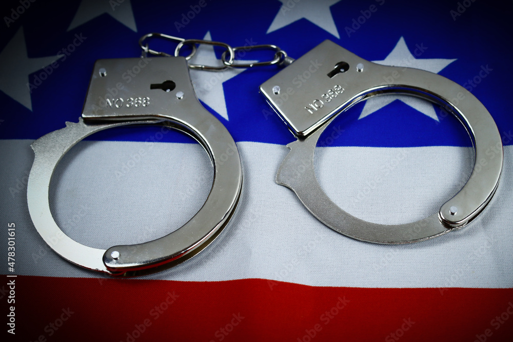 handcuffs on the background of the USA flag, the concept of crime in the United States of America
