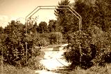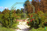 Green arch and path in beautiful spring rose garden at sunny day. Lots of greenery, lush bushes with blossoming red roses, trees, shrubs. A botanical garden in summer. Landscape design in rosarium.