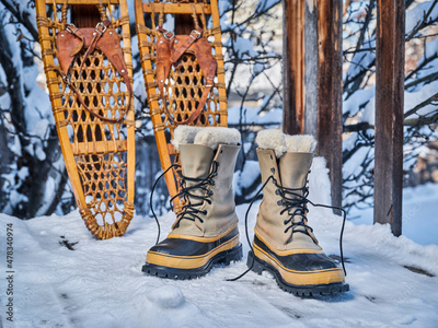 Heavy snow boots and classic wooden snowshoes on wooden deck in a backyard covered by snow