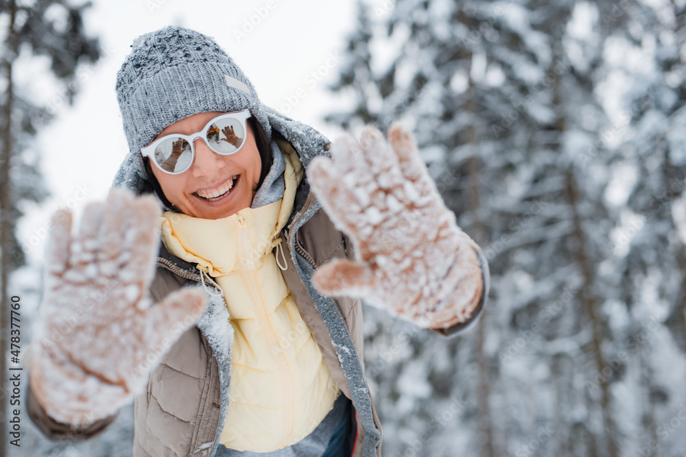happy woman walking outdoors on a snowy winter day. Female happy cheerful dressed fashionable grey wearing sunglasses