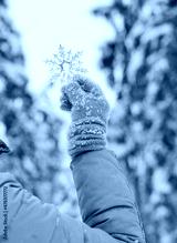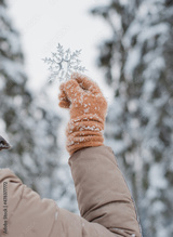 hand in mitten holding decorative transparent snowflake, winter forest natural background.