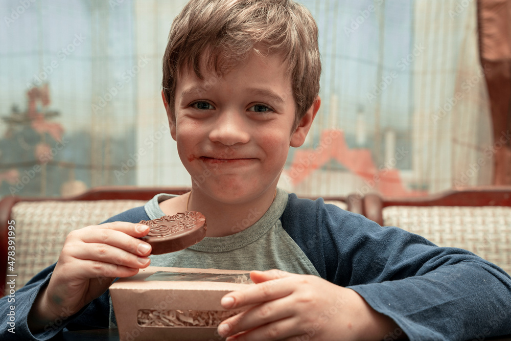 portrait of a funny cute Caucasian boy who eats chocolate sitting at a table in a home kitchen