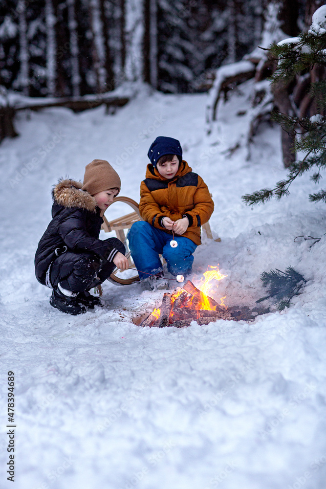 winter picnic. boys near the fire in the forest in winter. fry marshmallows. bonfire in the winter forest. winter forest picnic