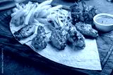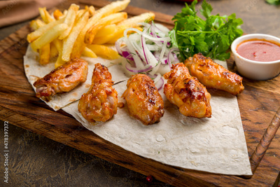 chicken wings in barbecue sauce with french fries, onion and tomato sauce