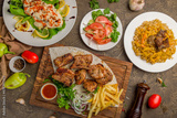Kebab of pork, steak of salmon on creamy sauce with red caviar, vegetable salad and pilaf with beef top view on brown table