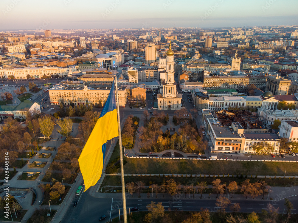 Flag of Ukraine with autumnal epic sunset sunny cityscape. City aerial view with Dormition Cathedral and clear sky in Kharkiv, Ukraine