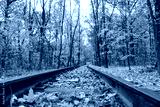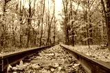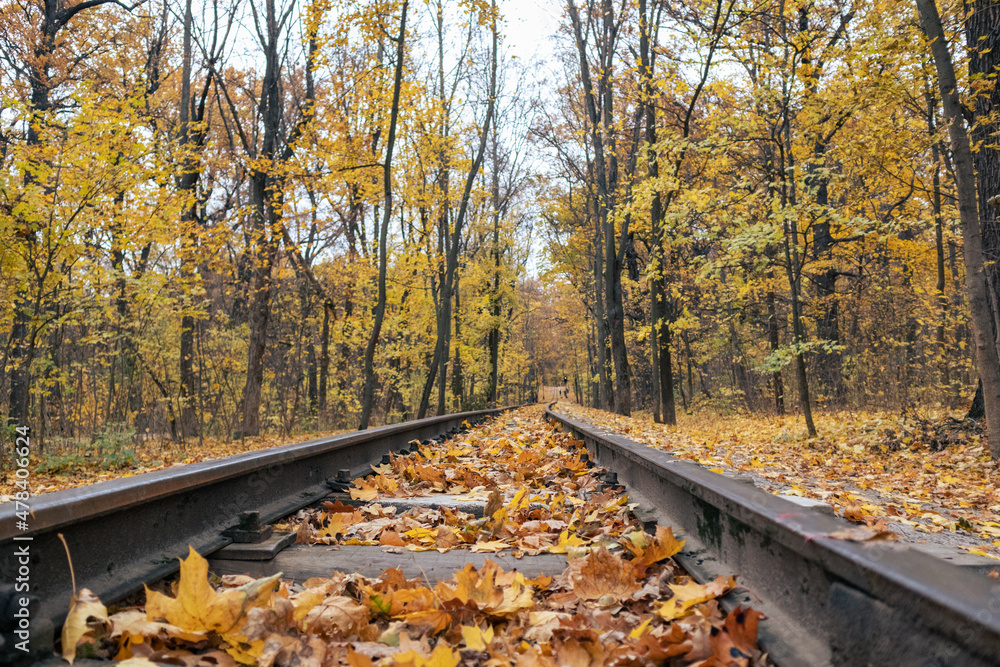 Railway track line close-up, fallen bright yellow leaves in autumn forest. Colorful Children's Southern Railway in Kharkiv, travel Ukraine