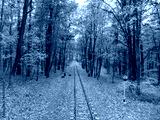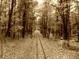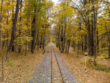 Fly above railway track line with traffic lights in bright yellow leaves in autumn forest. Colorful Children's Southern Railway in Kharkiv, travel Ukraine