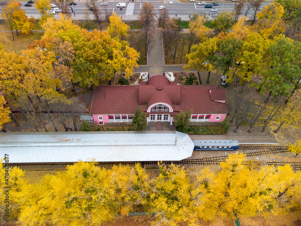 Fly above Children's Southern Railway Station. Track line and platform with train in vivid yellow autumn trees. Aerial treetop view on colorful Kharkiv, travel Ukraine