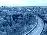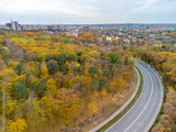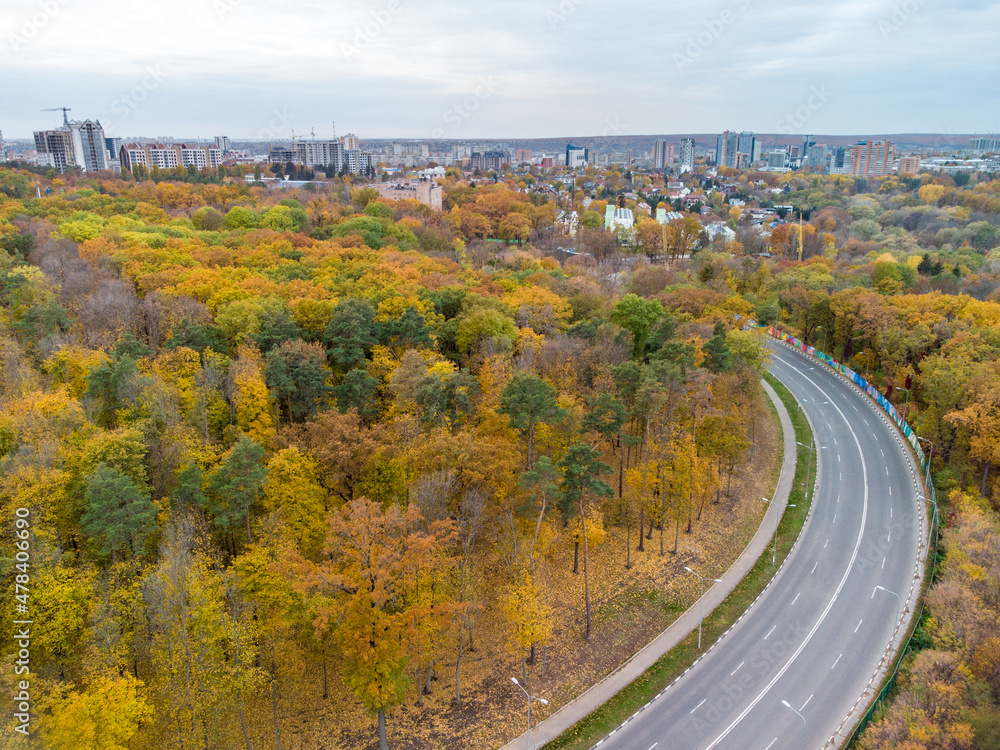 Aerial scenic road curve in autumnal yellow forest near residential district. Fly above street in autumn city park. Treetop view on Kharkiv, Ukraine