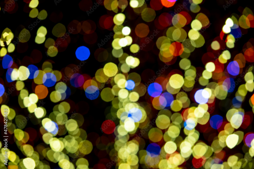 Holiday lights in out of focus. Christmas lights. Holiday background. Winter illuminations.