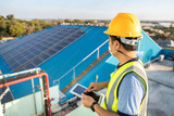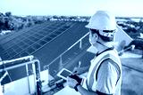 Engineer use tablet technology checking the operation of the system Solar power on the roof, Photovoltaic module idea for clean energy production. solar panel on roof.