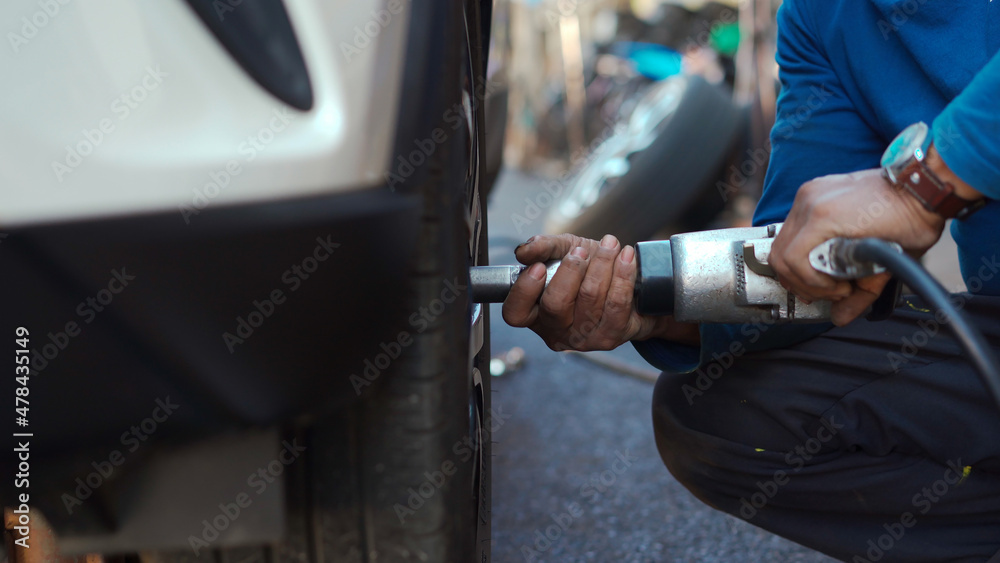 mechanic man using electric drill to loosen the bolts of vehicle wheel for changing a car tire
