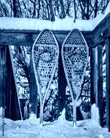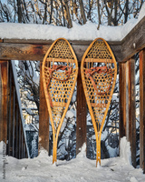 Classic wooden snowshoes (Huron) on a wooden deck in a backyard covered by snow