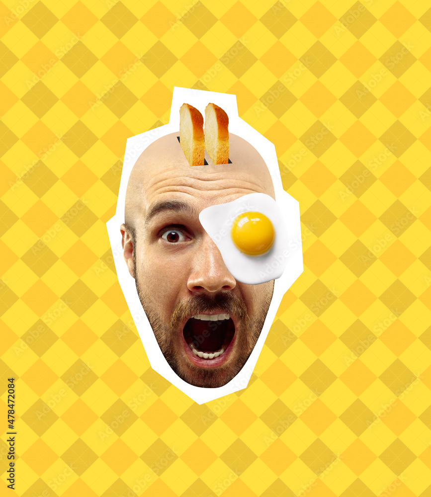 Modern design, contemporary art collage. Inspiration, idea, trendy urban magazine style. Surrealism. Male head like toaster