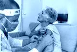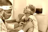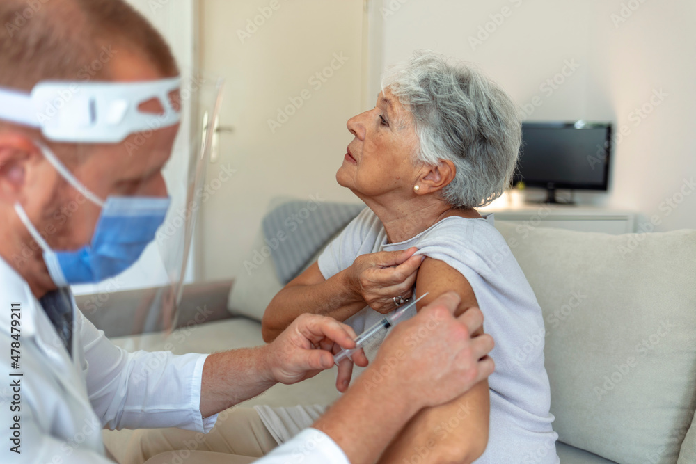 Close-up of senior woman receiving a vaccine due to coronavirus pandemic. Two people, woman receiving a covid-19 vaccine by a male doctor in protective suit in vaccination center.