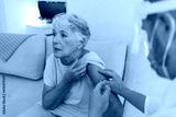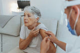 Young male doctor preparing syringe for vaccination of a senior woman at medical clinic. Nurse with protective face mask on sitting at home and giving injection to an old woman during corona outbreak.