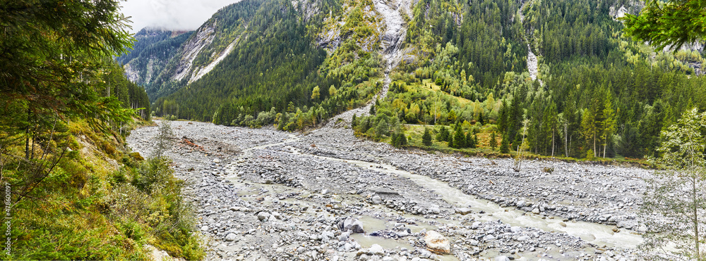 Schönes Panorama mit Bergbach in den österreichischen Alpen, Salzburger Land, Obersulzbachtal, bei Neukirchen.