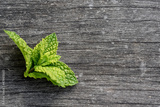 Blossom green mint leaves on wooden background. copy space for text