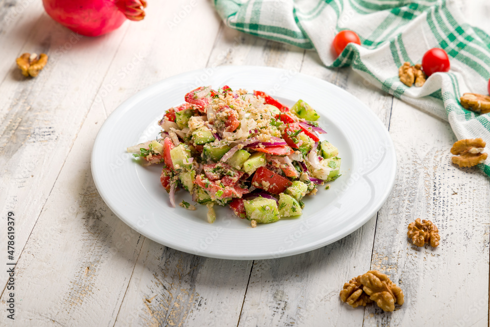 vegetable salad with tomato, cucumbers and red onion and nuts on white plate on white wooden table