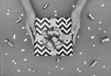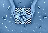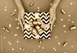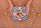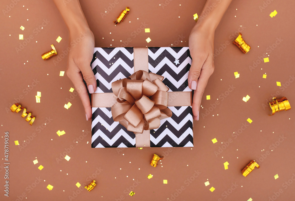 gift box with a bow in female hands on a brown background with a place for text with shiny decor