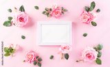 Happy Women's Day decoration concept. Top view of roses flower with picture frame on pink pastel background.