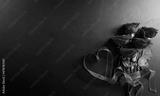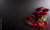Love and Valentine's day concept made from red rose and heart ribbon on black wooden background. Top view with copy space, flat lay.