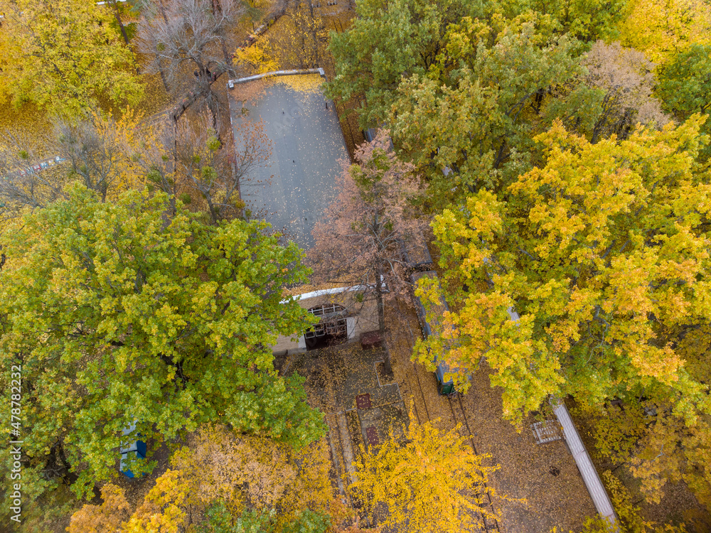 Track line and train shed in vivid yellow autumn forest. Fly above Children's Southern Railway Station. Aerial treetop view on colorful Kharkiv, travel Ukraine