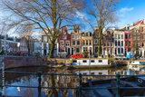 Sunny winter Amsterdam canal Spiegelgracht with typical dutch houses, Holland, Netherlands.