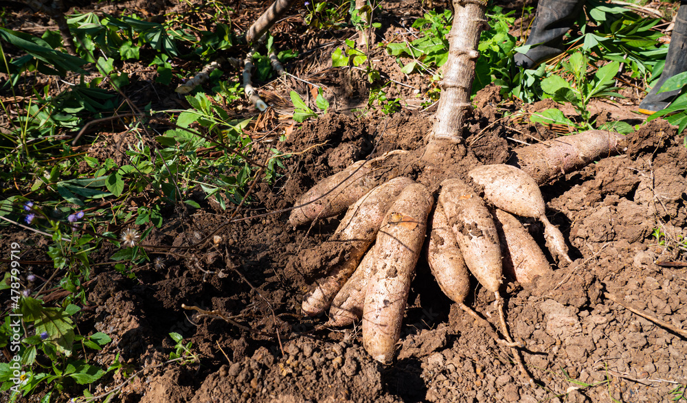 Cassava is dug up underground. Clumps of agricultural produce grown underground.
