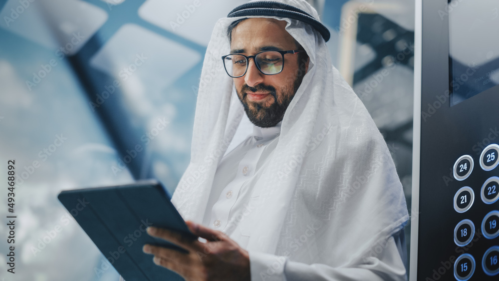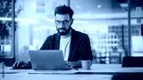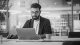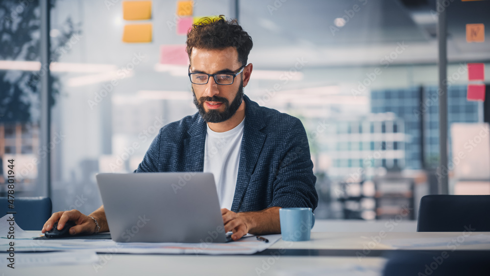 Modern Office: Portrait of Young Stylish Businessman Wearing Glasses Works on Laptop, Does Data Analysis, Website Design, Creative Developemnt. Digital Entrepreneur Works on e-Commerce Startup Project