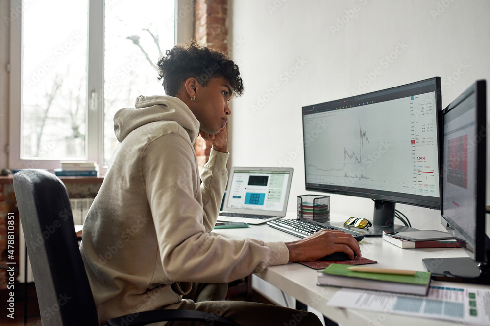 Young guy looking focused while trading online using pc, sitting at home in modern living room office