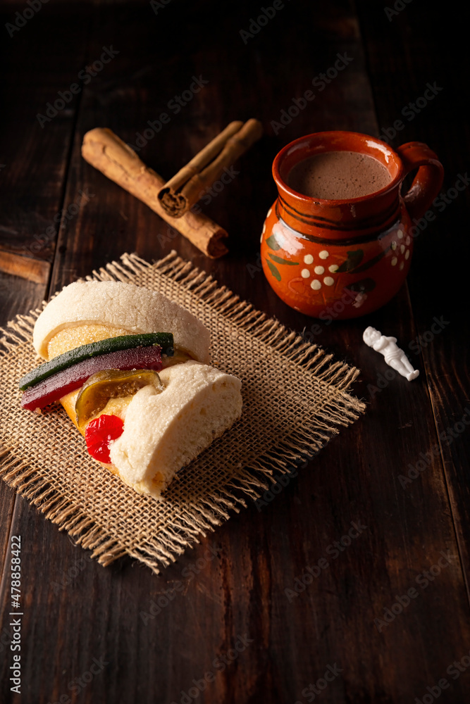 Traditional Kings day cake also called Rosca de Reyes, roscon, Epiphany Cake and with a clay Jarrito. Mexican tradition on January 5th