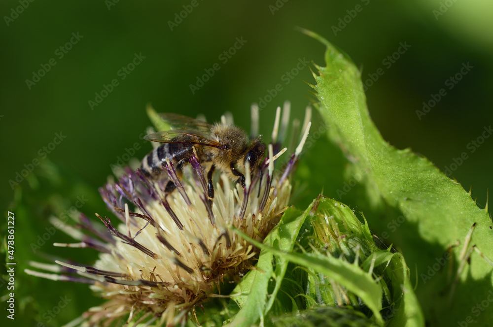 Close-up of a honey bee searching for pollen and food on the flower of a silver thistle, against a green background