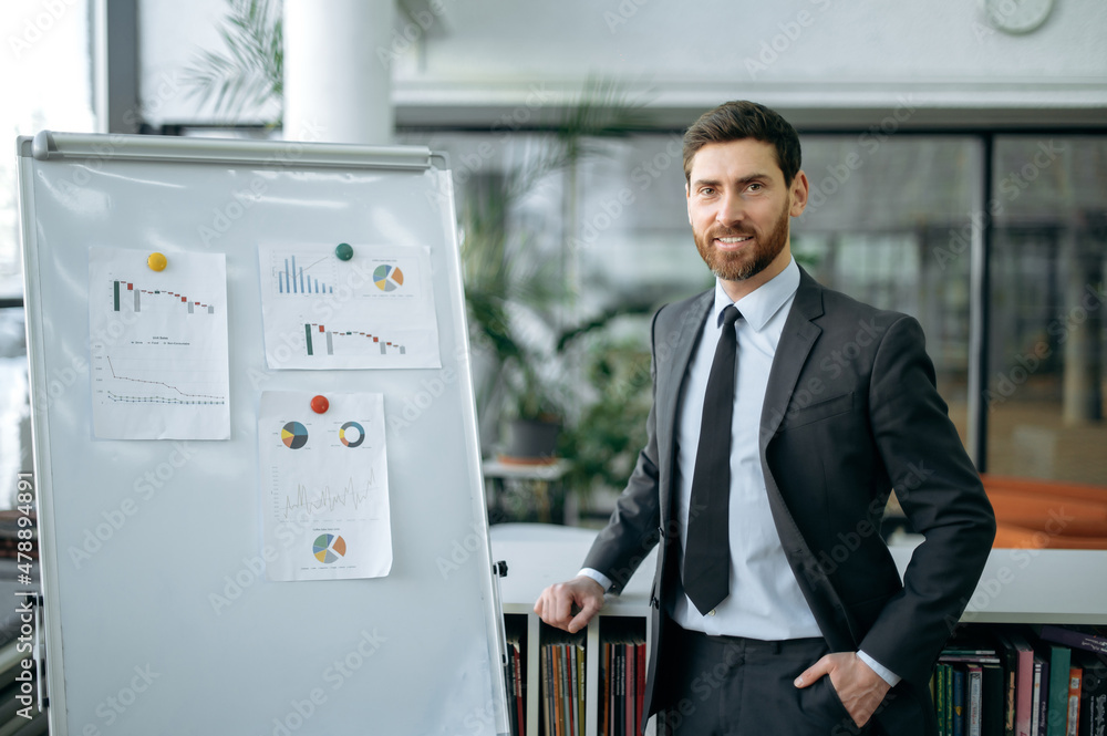 Portrait intelligent attractive positive bearded Caucasian adult businessman, financial analyst, department head, stands near the whiteboard in office, looking at the camera, smiling friendly