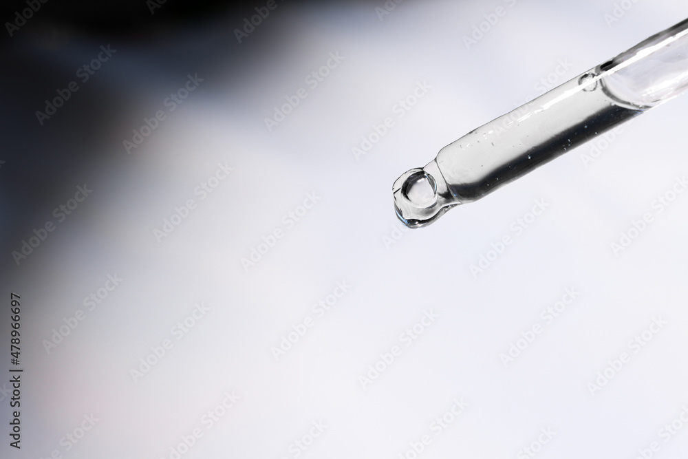 Hyaluronic acid in a glass pipette on a solid background. Transparent cosmetic product for body skin care and moisturizing. Bubble gel health concept.