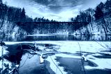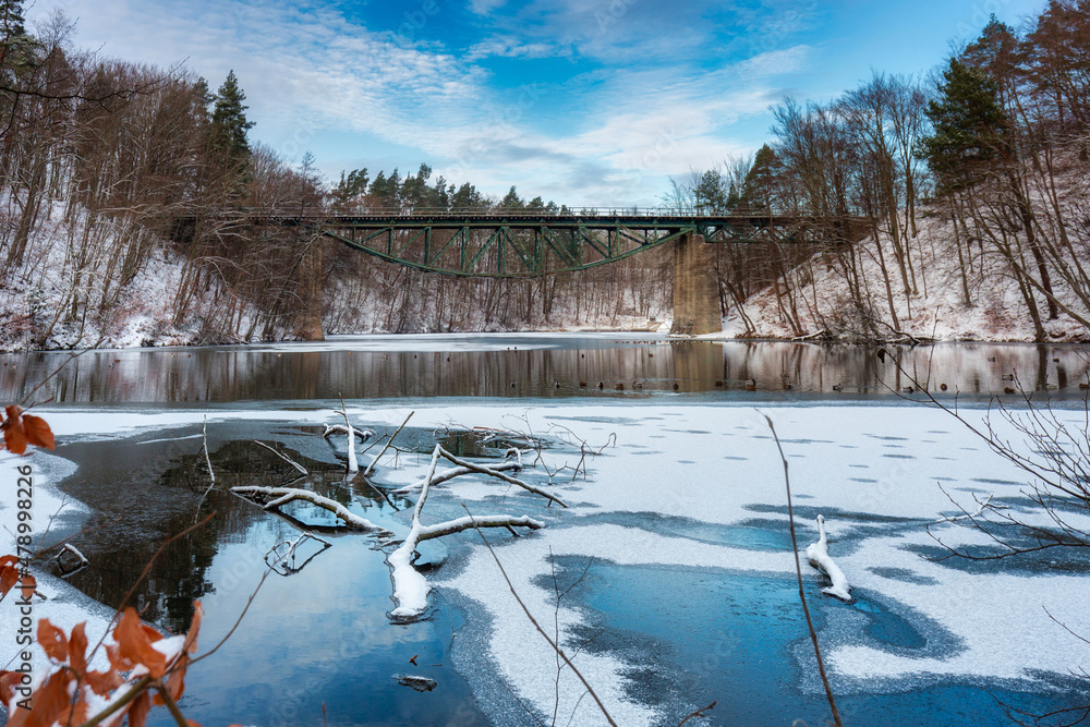 Winter scenery of the railway bridge in Rutki, Kashubia. Poland