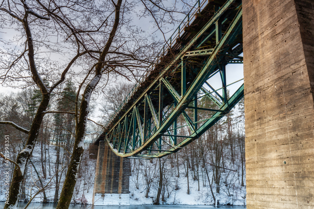 Winter scenery of the railway bridge in Rutki, Kashubia. Poland