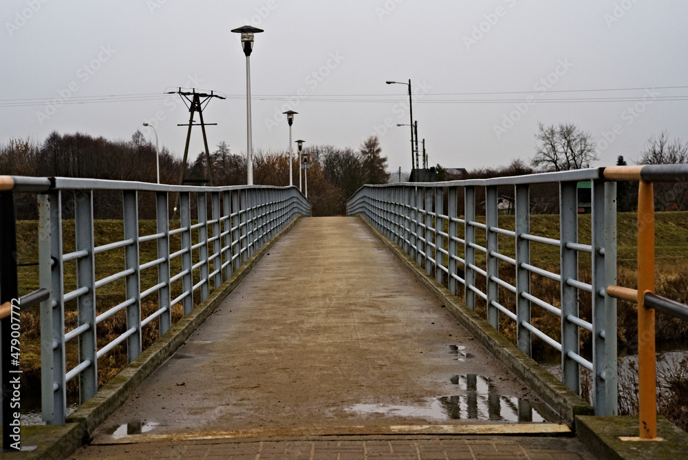 Mostek kładka dla pieszych , z barierkami , nad rzeką Kamienną . Bridge on a pedestrian footbridge, with barriers, on a Stone river.
