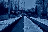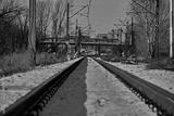 Tory kolejowe ( szyny) w śniegu, biegnące w stronę wiaduktu .