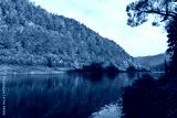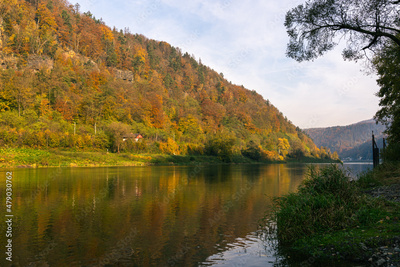 Low angle view of Elbe Sandstone Mountains national park, Czech Republic. Canyon of river Labe surrounded by sandstone rock formations in autumn. Colorful autumnal trees on sunny day