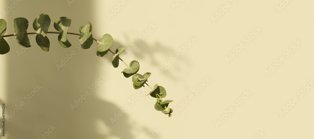Green leaves eucalyptus branch with reflection on beige wall. Light and shadow nature horizontal copy space background.