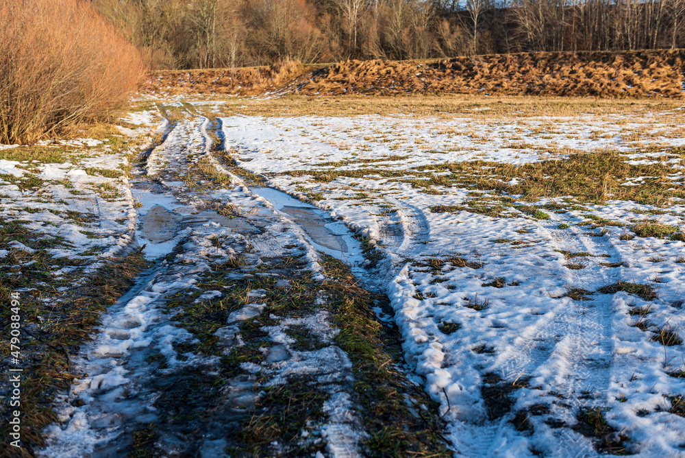 Melting ice on a country road in winter day
