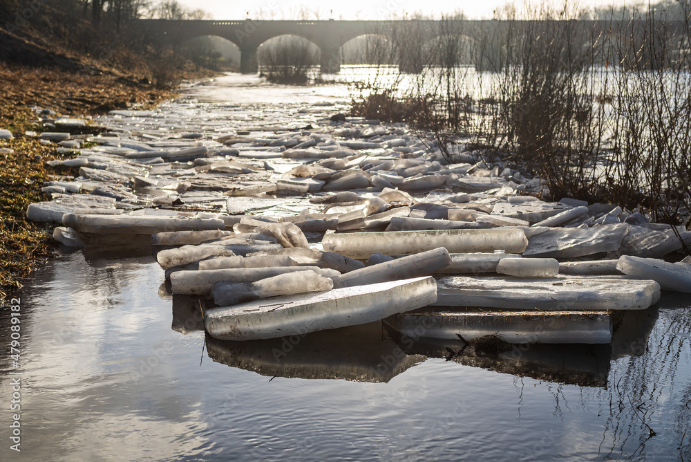Close up view of ice drift on the frozen river. Melting ice. Flooded road. Old bridge. Concept of spring floods