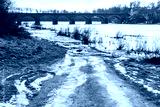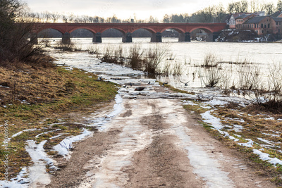 Close up view of ice drift on the frozen river. Melting ice. Flooded road. Old bridge. Concept of spring floods