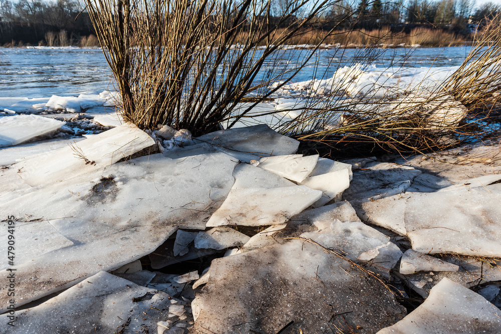 Close up view of ice drift on the frozen river. Melting ice. Pieces of ice have formed near the bushes. Concept of spring floods