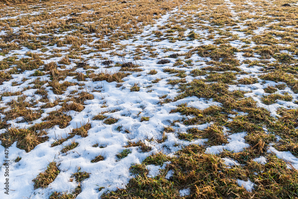 Snow is melting in the meadow. The onset of spring