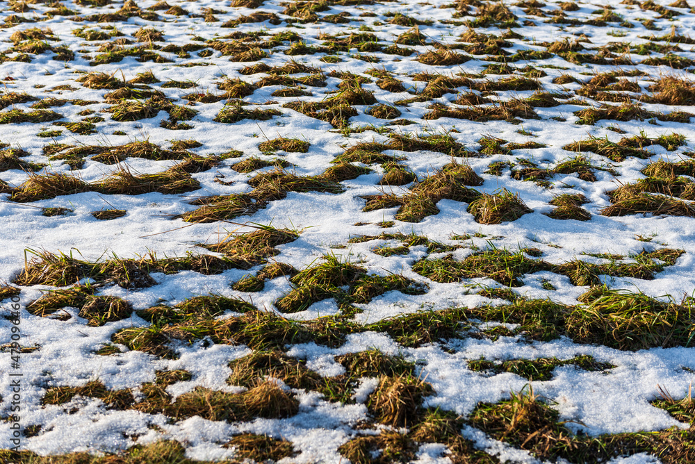 Snow is melting in the meadow. The onset of spring